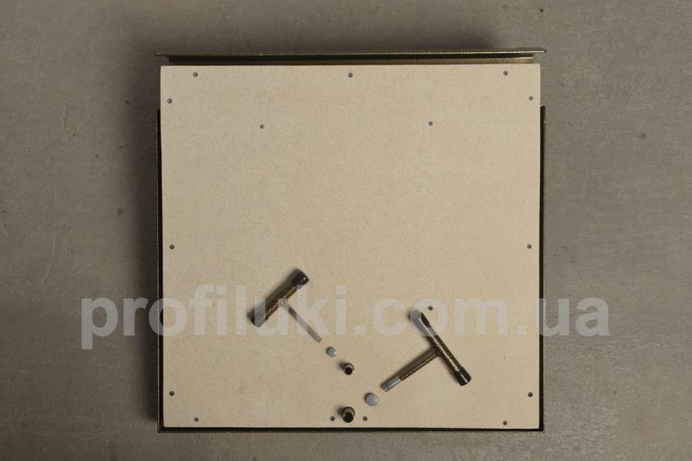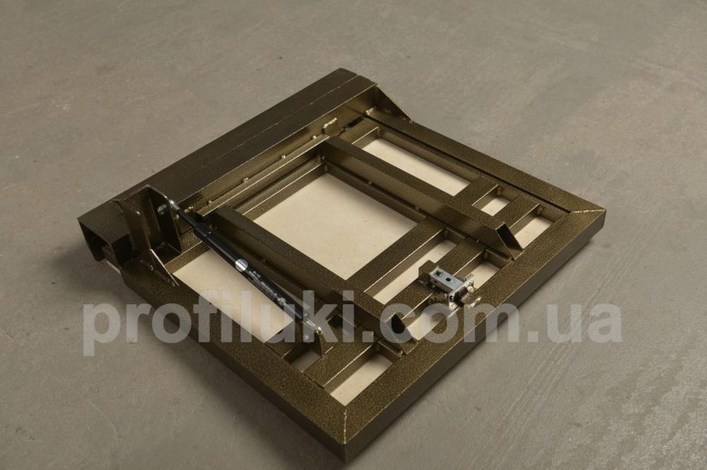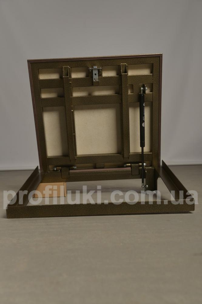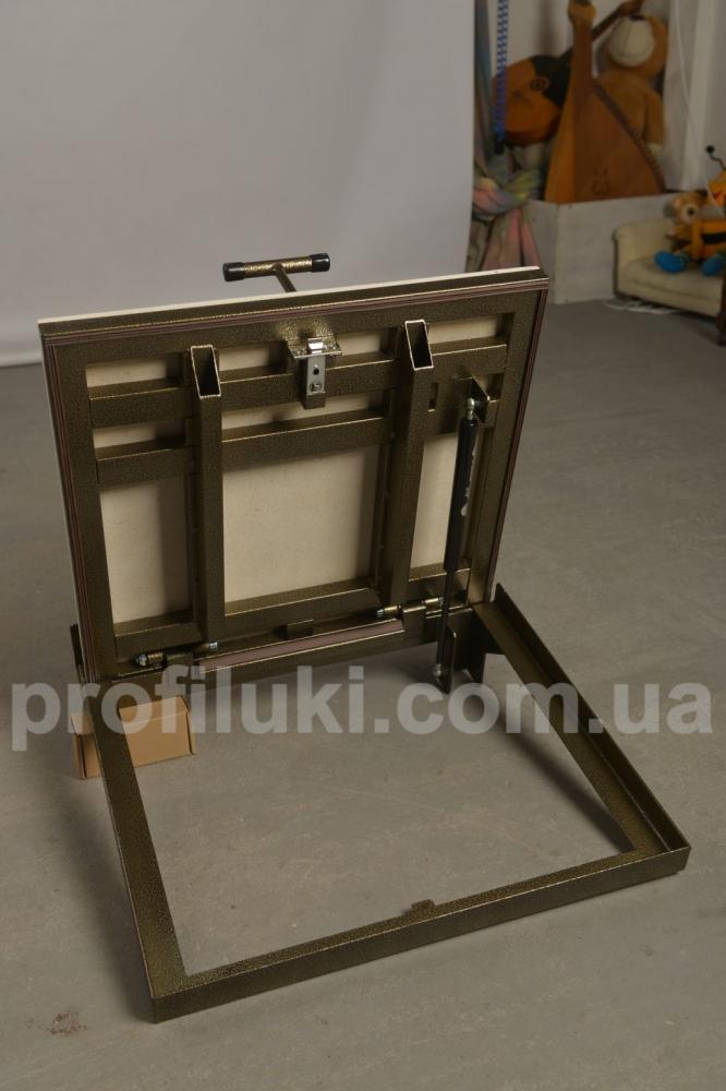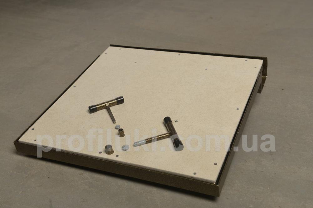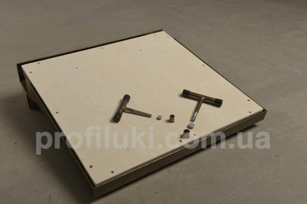 Люк виготовлен із сталевого профіля та пофарбован порошковим методом. Кришка люка оздоблена гіпсоволокнистим вологостійким листом «VIDIWALL» КНАУФ. Вона посилена поздовжніми та поперечними підсилювачами, завдяки яким має підвищєну жорсткість та вантажопідйомність. По периметру на рамі люка встановлений гумовий ущільнювач. Цей тип підлогового люка комплектуються надійними замками ручками для зручного відкривання. Люк має дуже просту та надійну конструкцію.