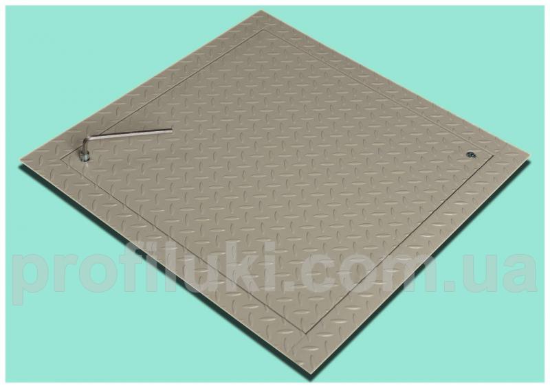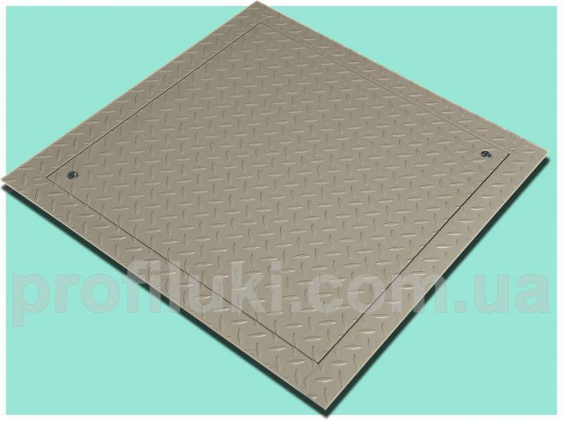 Конструкция видимого напольного люка тип «Эконом Плюс» очень проста и надёжна. Каркас рамы люка, каркас крышки люка и рёбра жёсткости на крышке люка выполнены из профильной квадратной трубы размером 20х40 мм и 20х20 мм. Эксплуатируемые видимые верхние поверхности рамы и двери люка выполнены из стального профильного листа толщиной 4мм. Этот лист имеет структурную поверхность, что исключает проскальзывание по люку человека, который на него наступает. Все части люка окрашены порошковой краской в два слоя (покраска + лак). Покраска производится в стандартный цвет. Есть возможность покраски в любой другой цвет по вееру RAL, при этом стоимость люка может измениться.