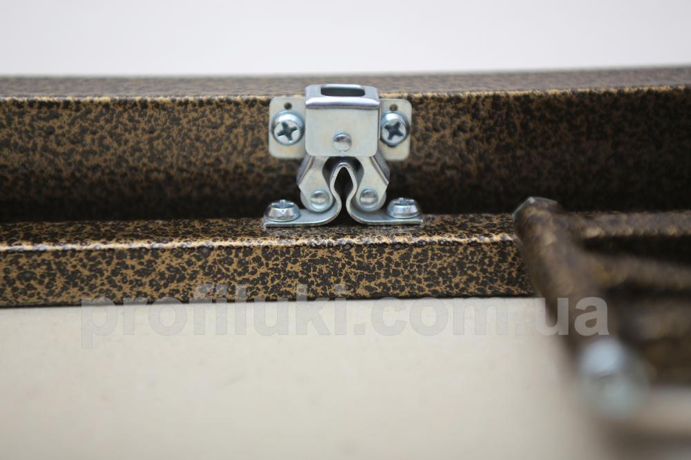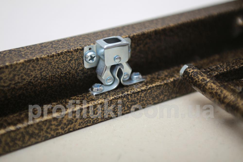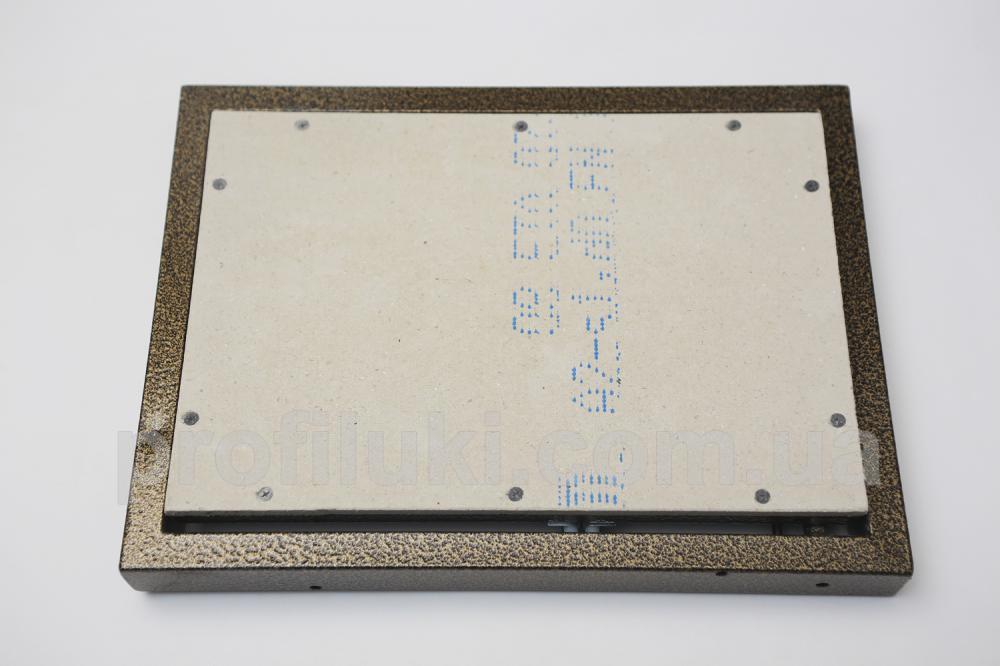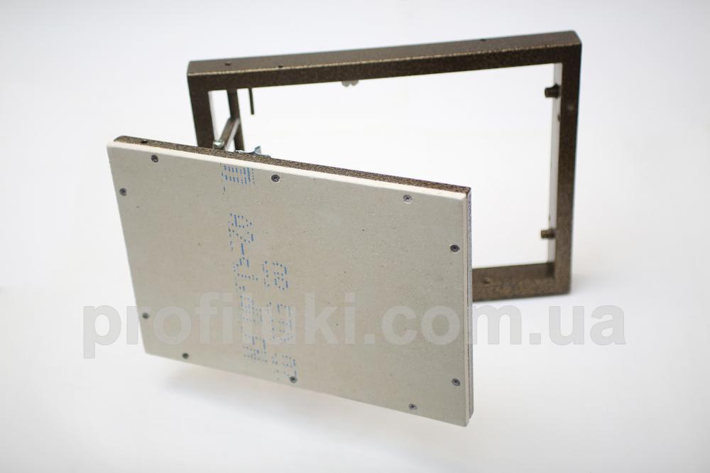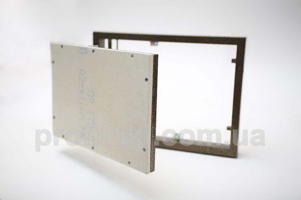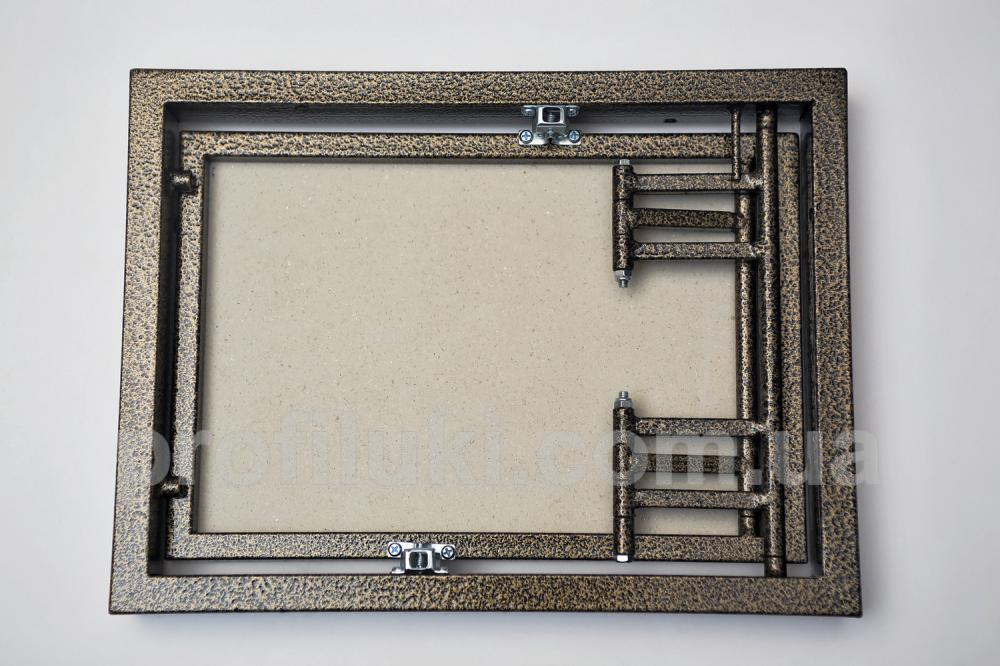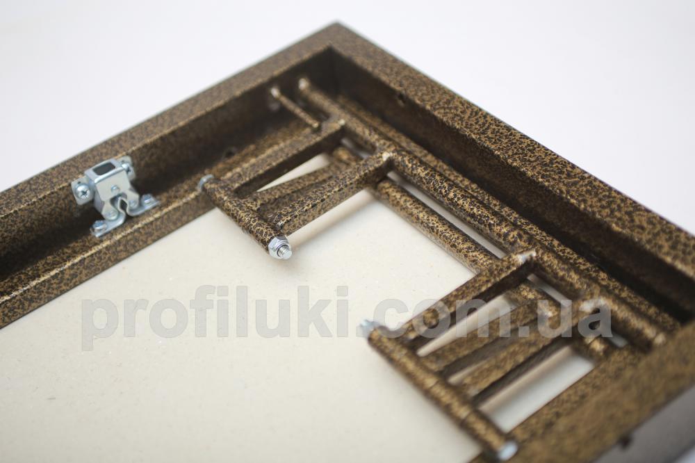Каркас ревизионного люка данного типа выполнен из стальной трубы прямоугольного сечения. Все металлические части люка окрашены порошковой краской и надёжно защищены от ржавения и коррозии. Люк снабжён сдвижными двойными петлями, способными нести максимальную нагрузку.