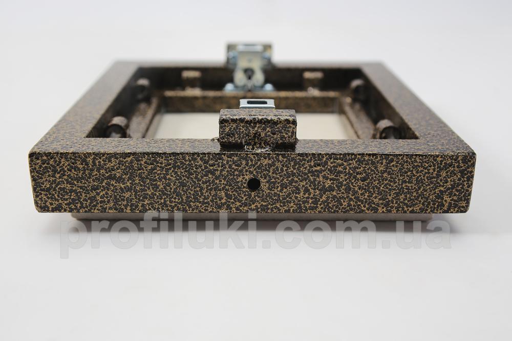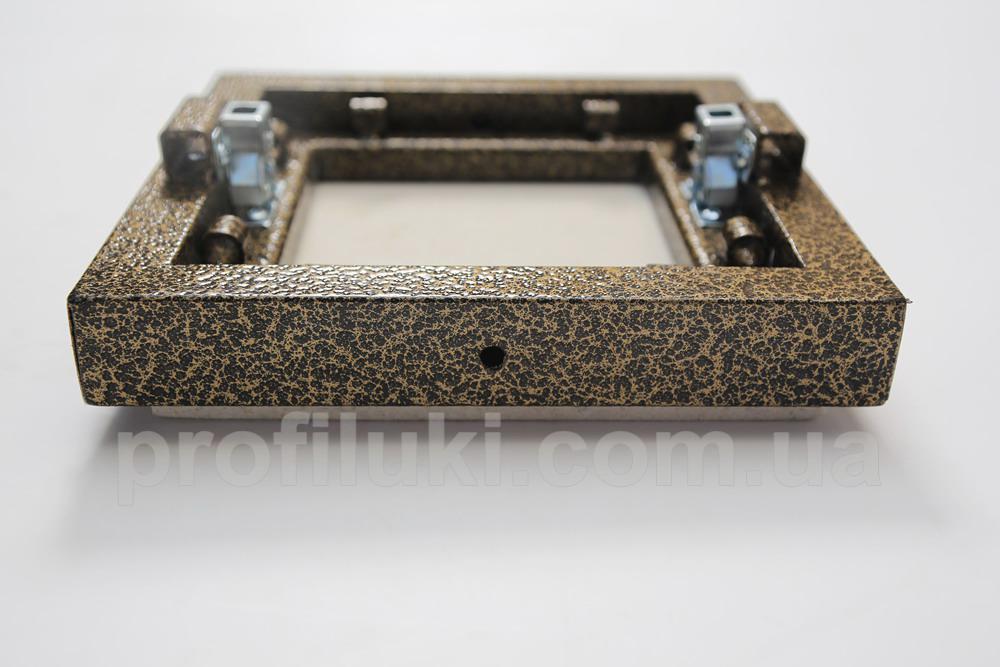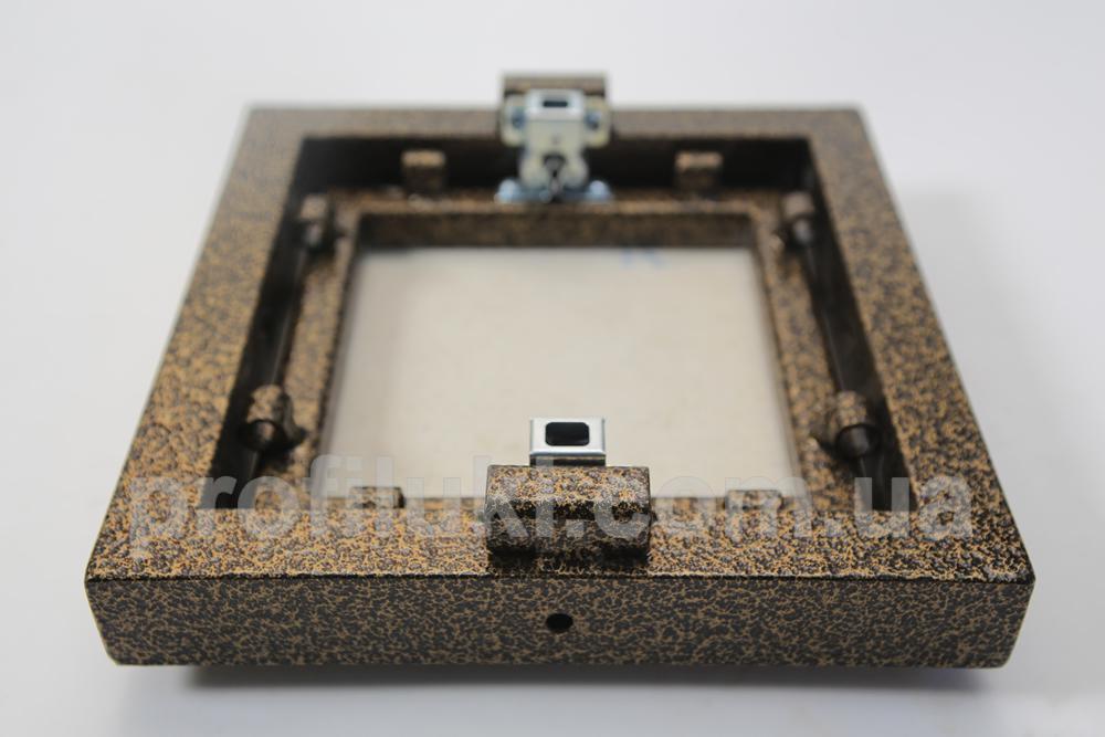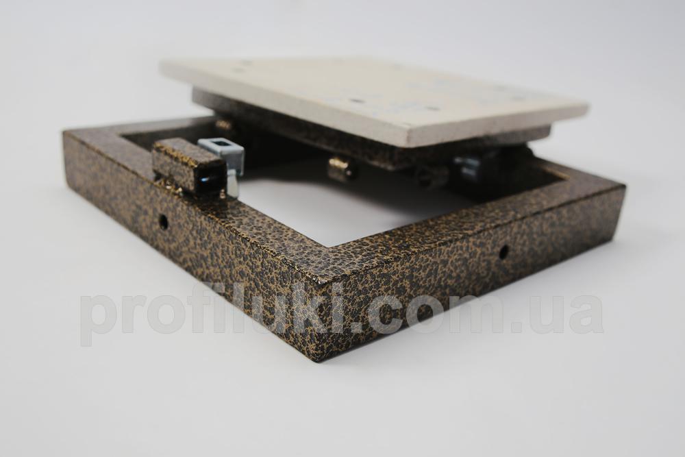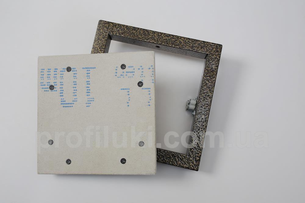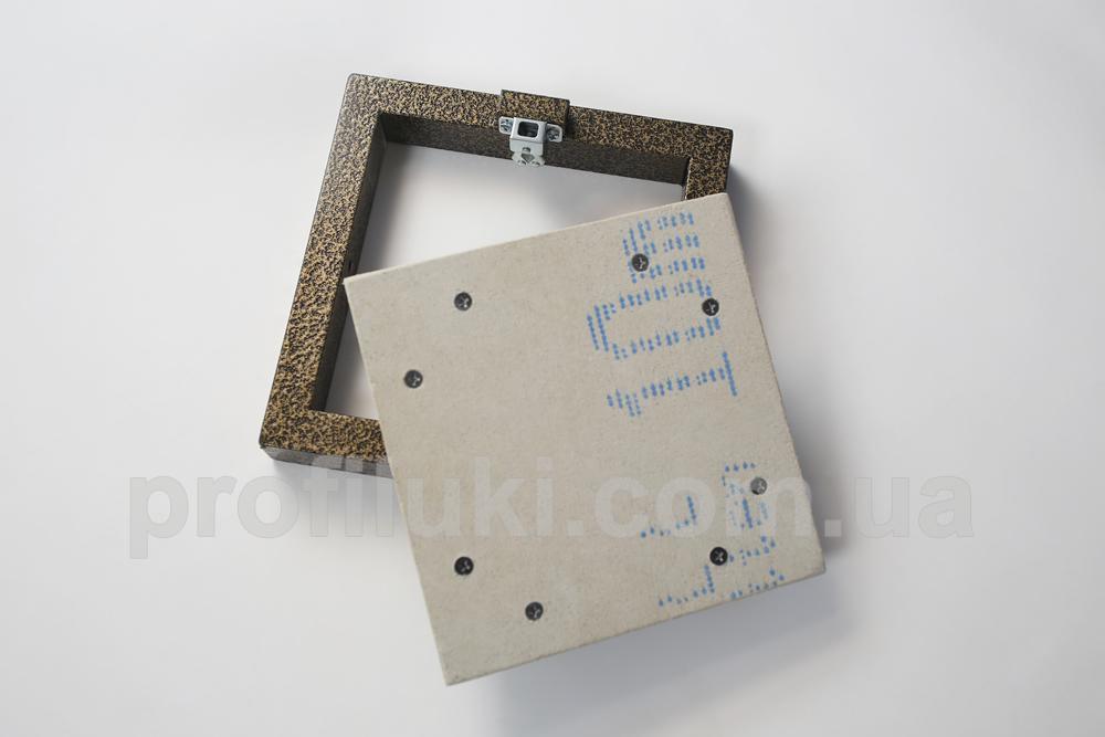 Каркас ревизионного люка данного типа выполнен из стальной квадратной трубы 30х20 или 30х30 мм в зависимости от размера люка. Все металлические части люка окрашены порошковой краской и надёжно защищены от ржавения и коррозии. На дверце люка установлена специальная влагостойкая гипсоволоконная плита производства ТМ «KNAUF». Эта плита изготовлена исключительно из экологически чистых компонентов и не содержит вредных веществ (асбест, смолы и прочие формальдегиды). Антисептические свойства этой панели, исключают появление на ней плесени и грибков.