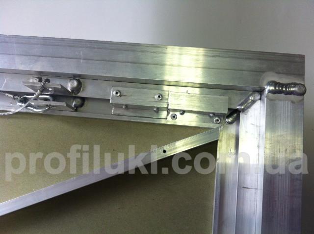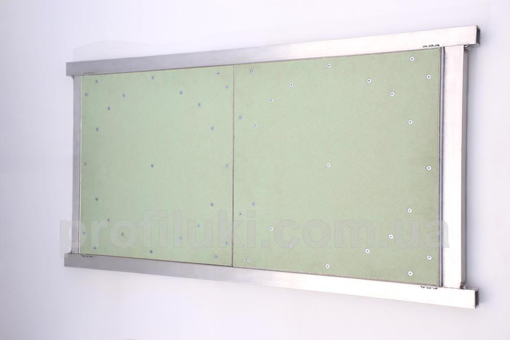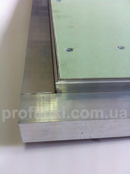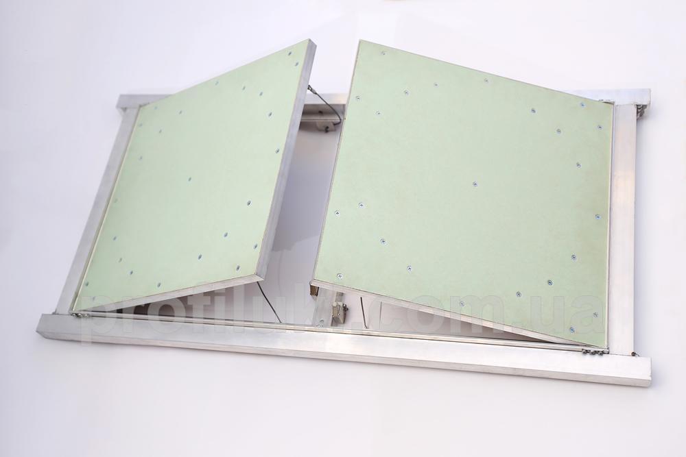 Каркас рамы и дверцы люка выполнен из специального алюминиевого профиля. Сам люк изготовлен при помощи аргоновой сварки всех его деталей. В каркас дверцы люка установлена гипсокартонная влагостойкая плита ТМ «Кнауф» толщиной 12,5 мм. Этот тип люка изготавливается в 1-но дверном, 2-х дверном и 3-х дверном вариантах. Люки этого типа также могут применятся в случаях, когда необходим доступ к большим проёмам в потолках.